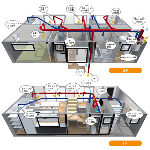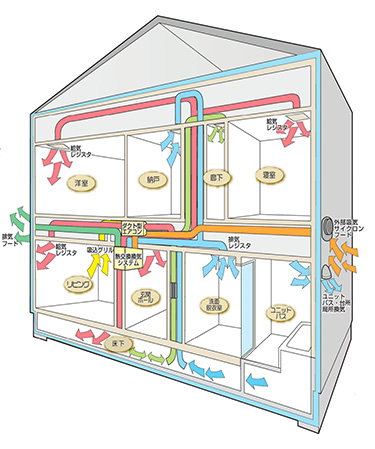 家全体の湿気や臭いは外部に排出しつつ、新鮮な外気を温めてから室内に取り込むため、大館市の厳しい夏冬でも快適な室内を実現。
