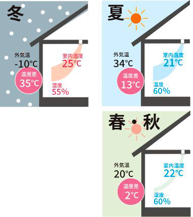 エアコン特有の不快な直風や、夏場に足元だけがひんやりするような冷えも抑え、家中を包み込むような自然な温度環境をつくります。