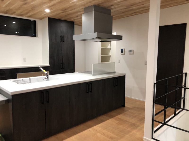 外観では、黒い壁面と玄関回りのウッドパネルを組み合わせることで、クールさと自然の温かみをバランスよく取り入れました。内観では、グレーと白の壁、木目の天井とフローリングを使用し、洗練された空間にナチュラルな要素を加えています。ダイニングキッチンの木目板柄は、家全体に一貫した統一感を与え、モダンでありながらも居心地の良い雰囲気を創り出しています。白で統一されたフローリングと天井により、清潔感と広がりが感じられる空間に仕上げられ、シンプルでありながらも洗練された美学が光るデザインを実現しました。