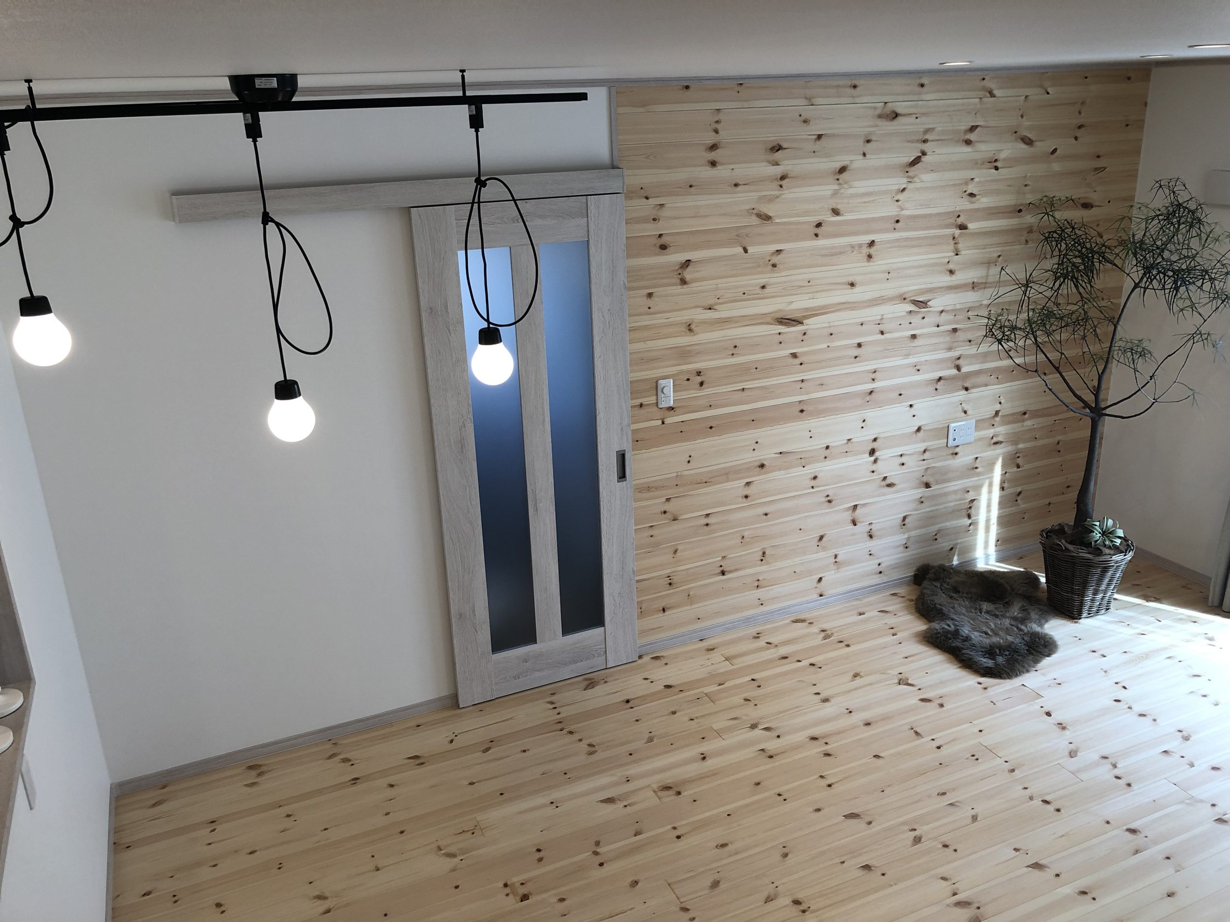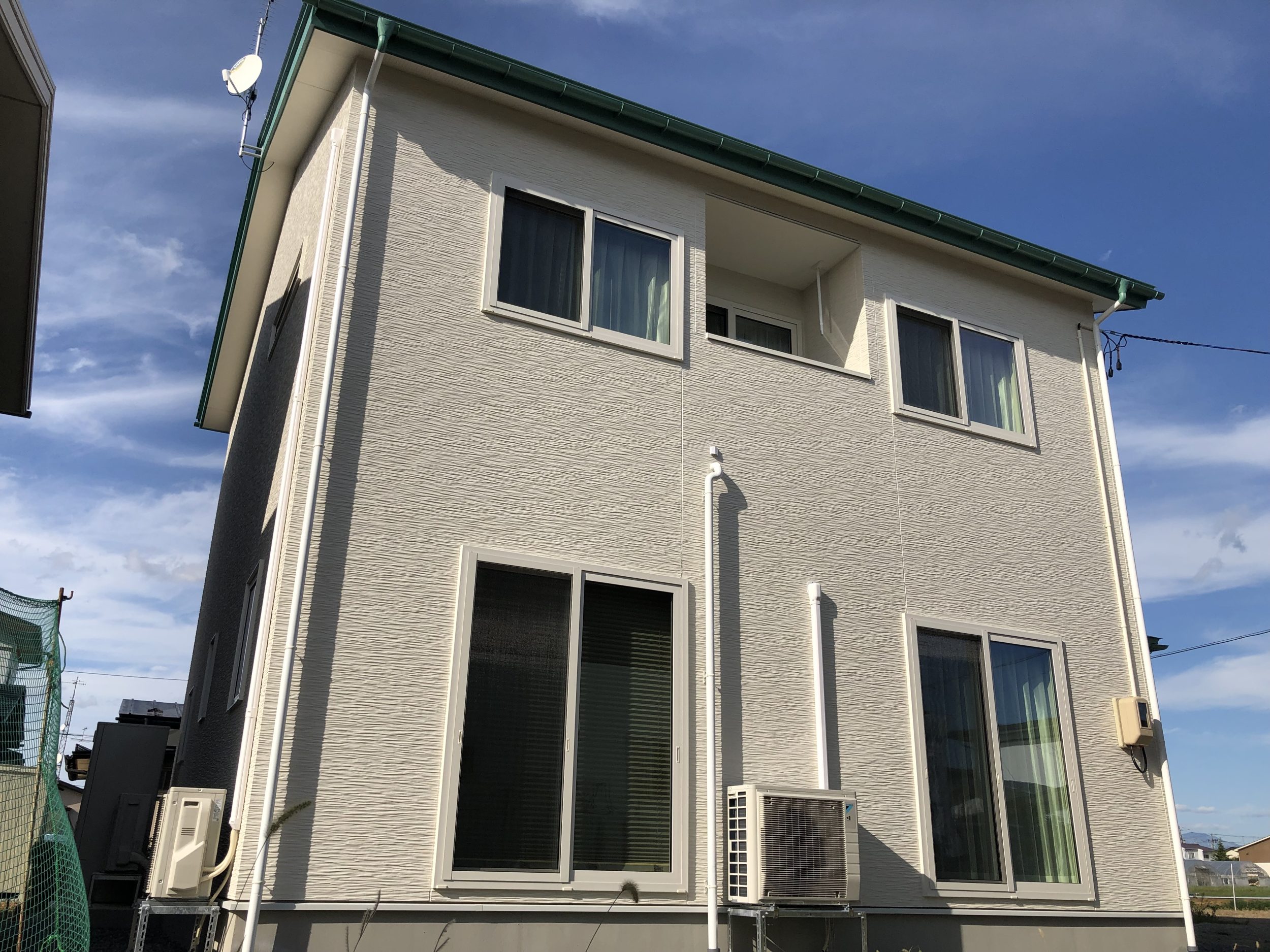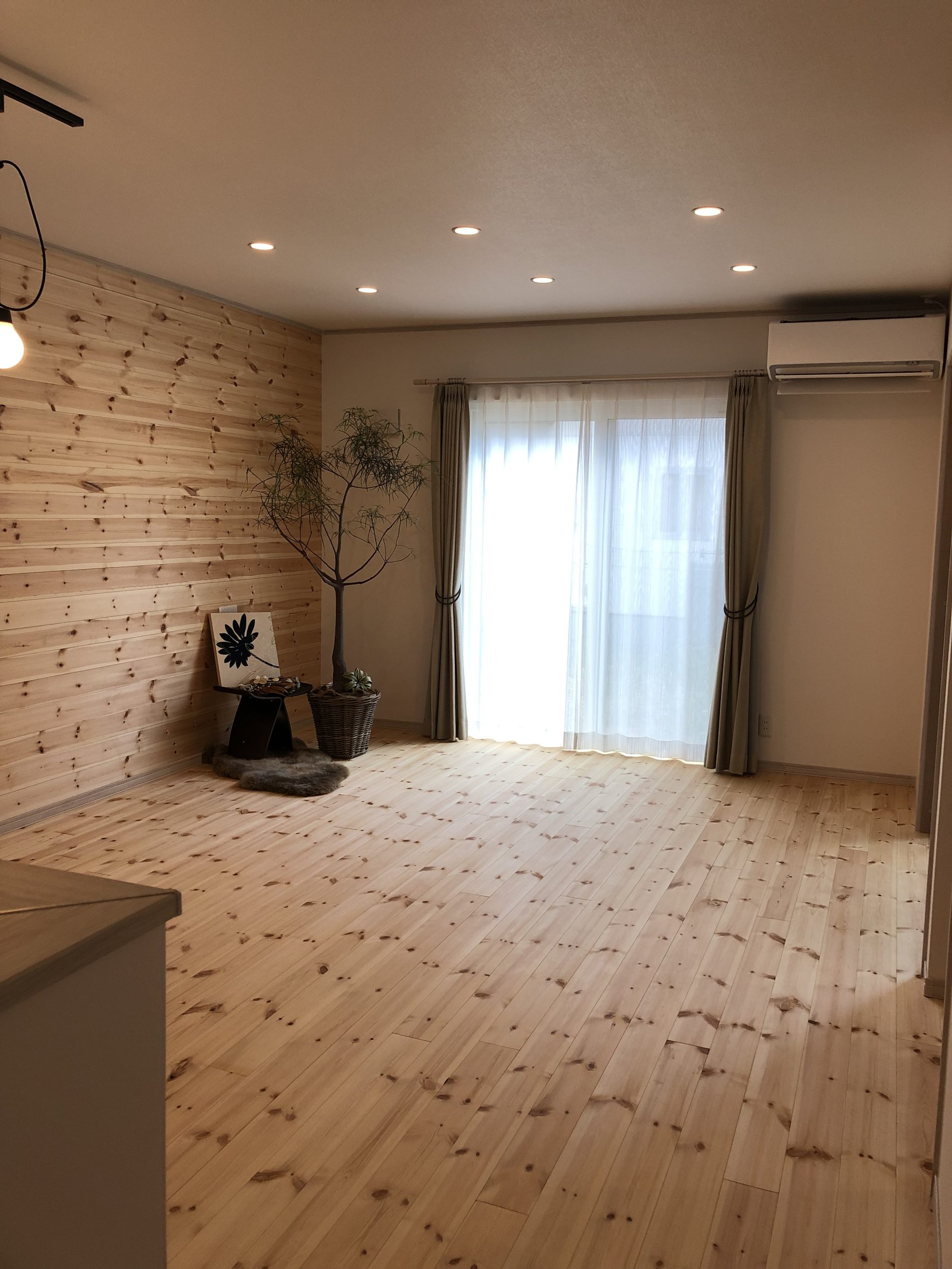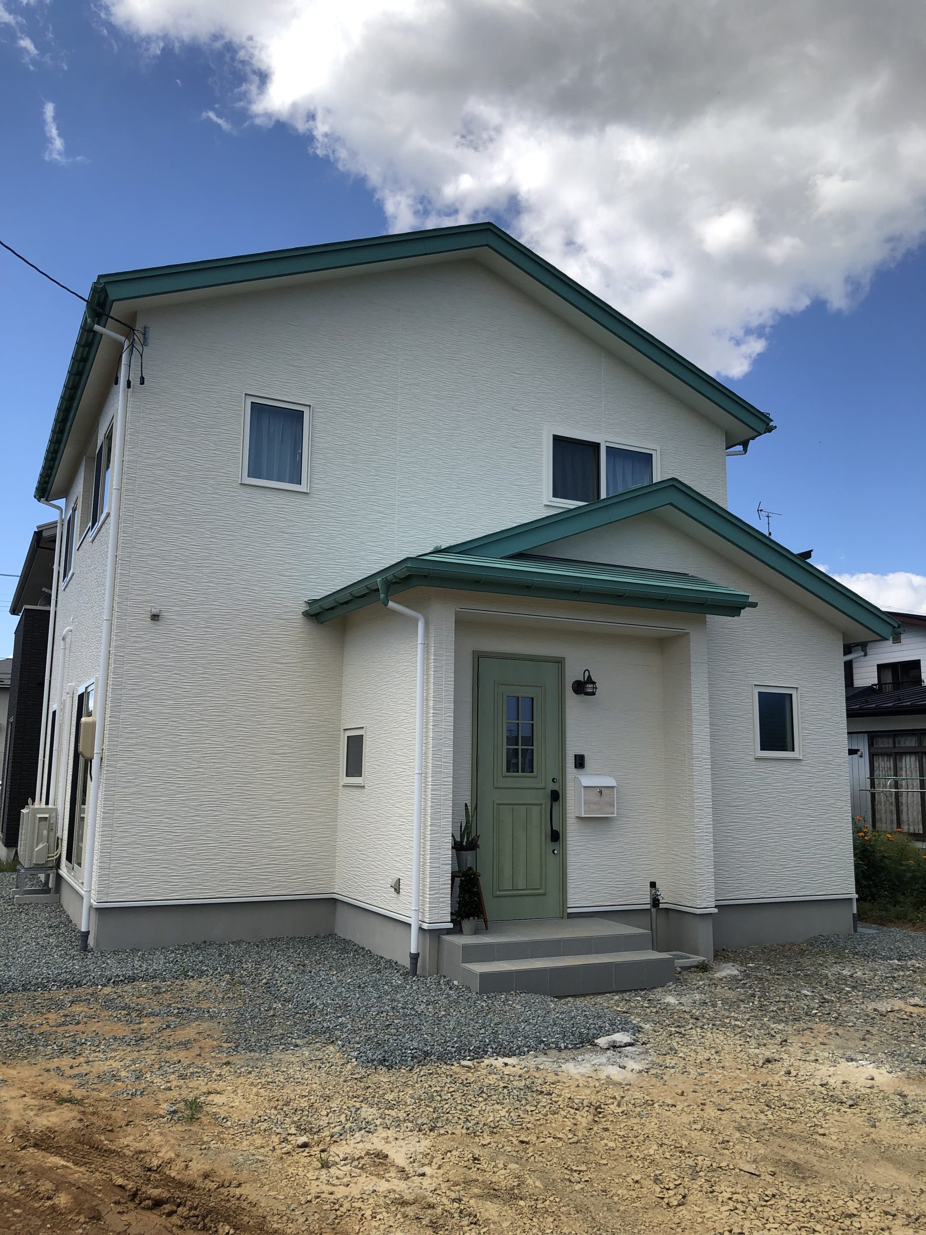 こ自然素材の温かみと個性を大切にしながら、シンプルで洗練されたデザインを目指しました。外観の白い外壁とグリーンの屋根、玄関ドアは、自然との調和を意識したカラーリングで、ナチュラルで優しい印象を与えています。内装は白無垢のフローリングと板張りの壁面を採用し、木の温もりを存分に感じられる空間を演出しています。部分的に黒の壁紙を取り入れることで、空間にアクセントを加え、全体のバランスを保ちながらもオリジナリティを持たせています。この家は、自然とモダンデザインを融合させ、居心地の良い空間を作り出すことをコンセプトとしています。