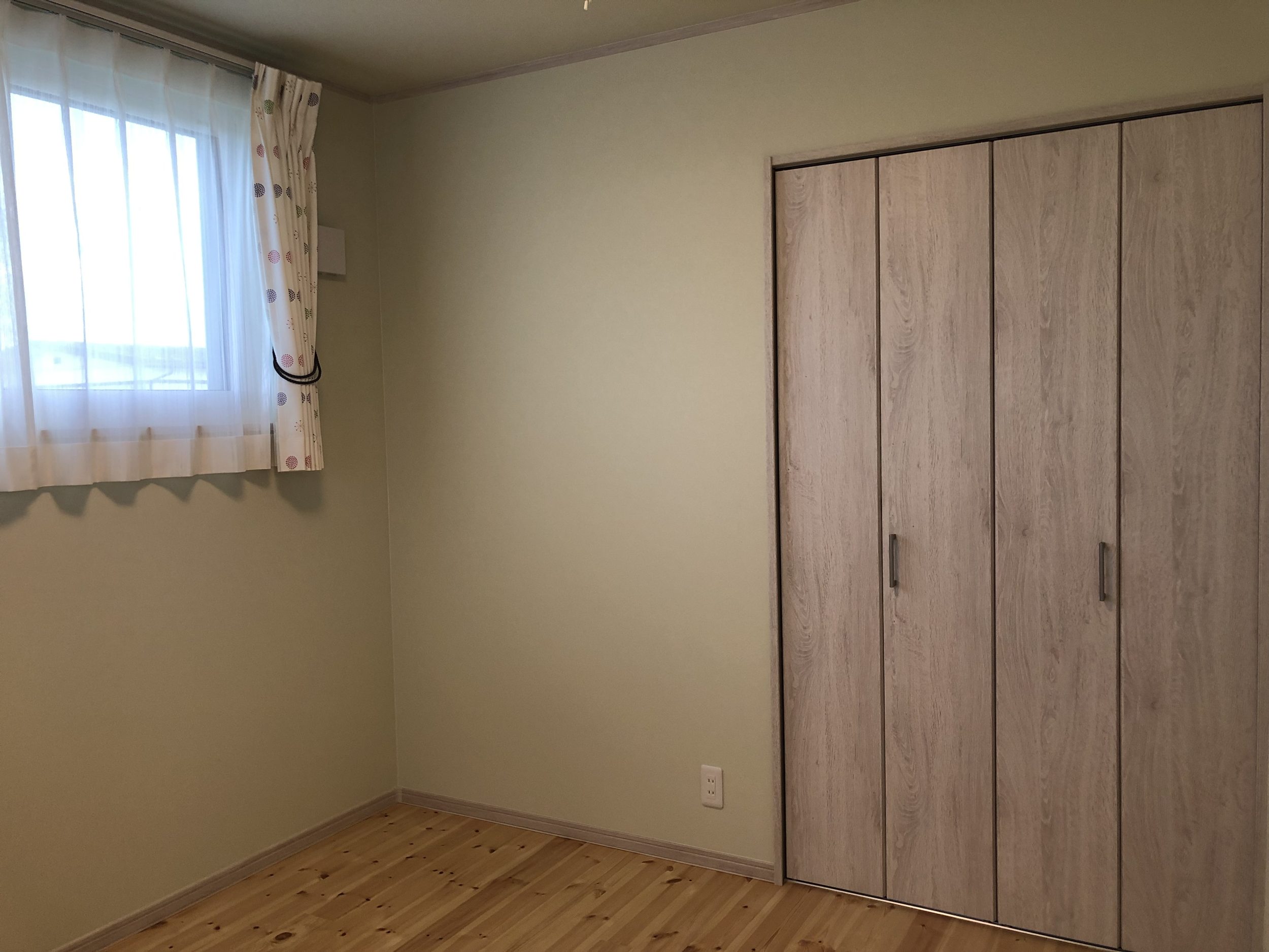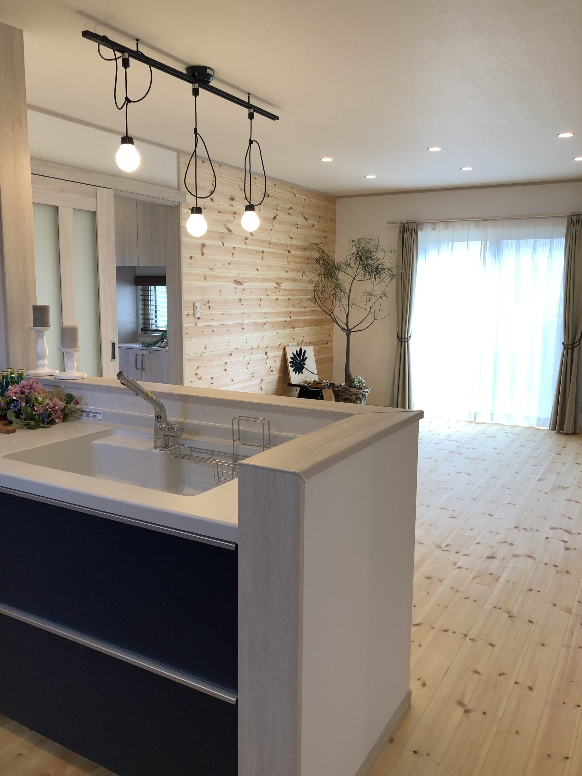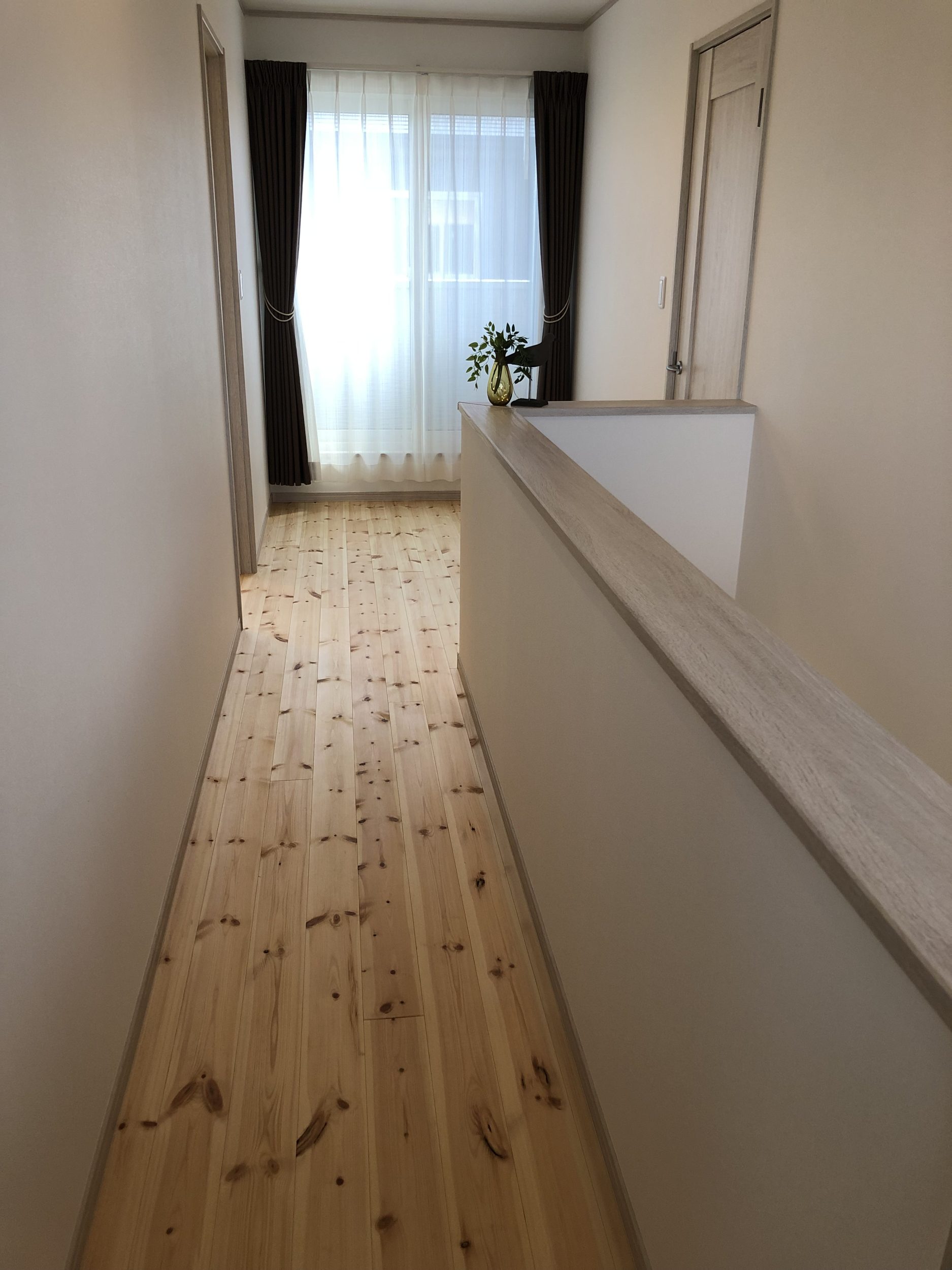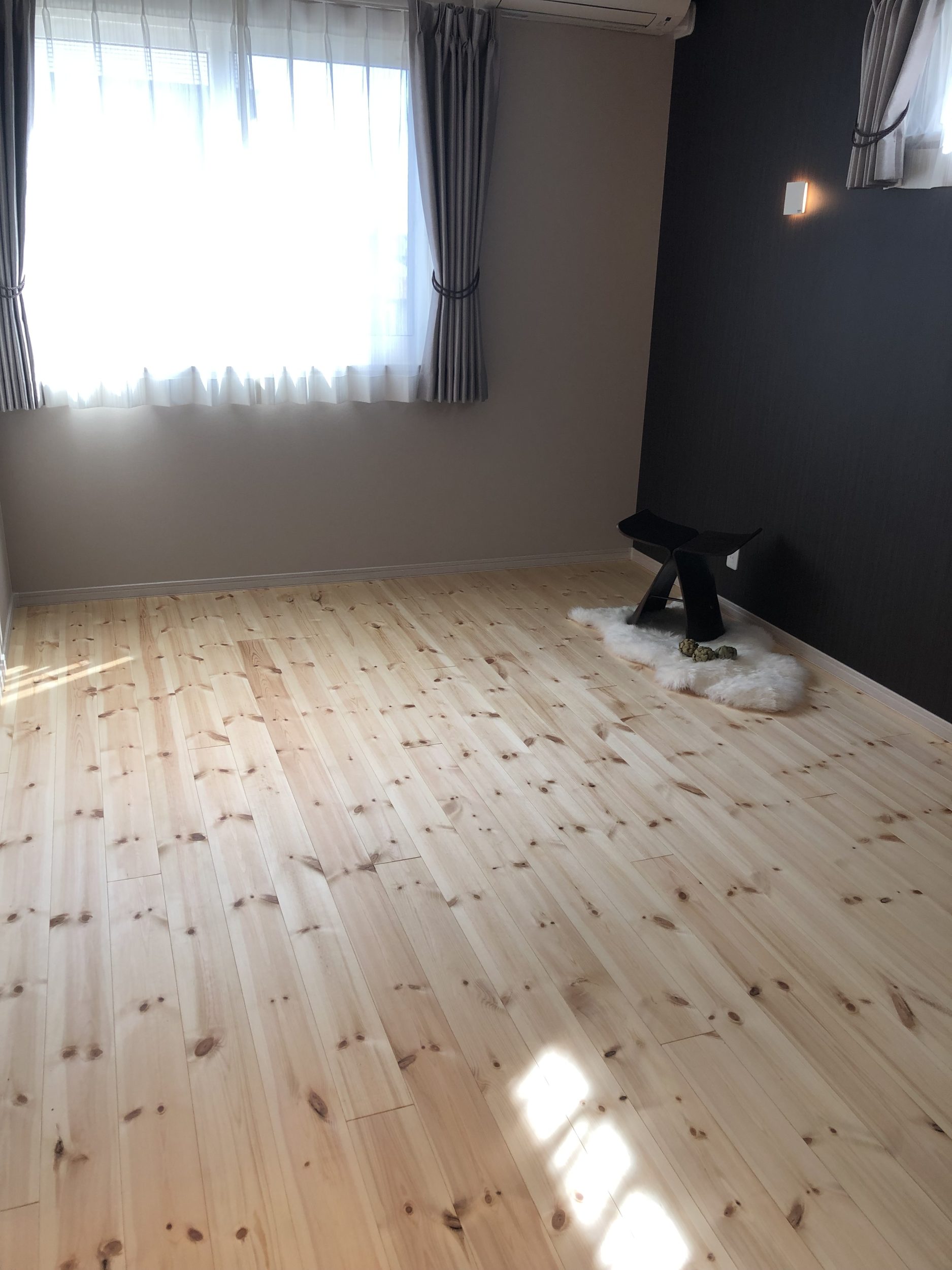 こ自然素材の温かみと個性を大切にしながら、シンプルで洗練されたデザインを目指しました。外観の白い外壁とグリーンの屋根、玄関ドアは、自然との調和を意識したカラーリングで、ナチュラルで優しい印象を与えています。内装は白無垢のフローリングと板張りの壁面を採用し、木の温もりを存分に感じられる空間を演出しています。部分的に黒の壁紙を取り入れることで、空間にアクセントを加え、全体のバランスを保ちながらもオリジナリティを持たせています。この家は、自然とモダンデザインを融合させ、居心地の良い空間を作り出すことをコンセプトとしています。