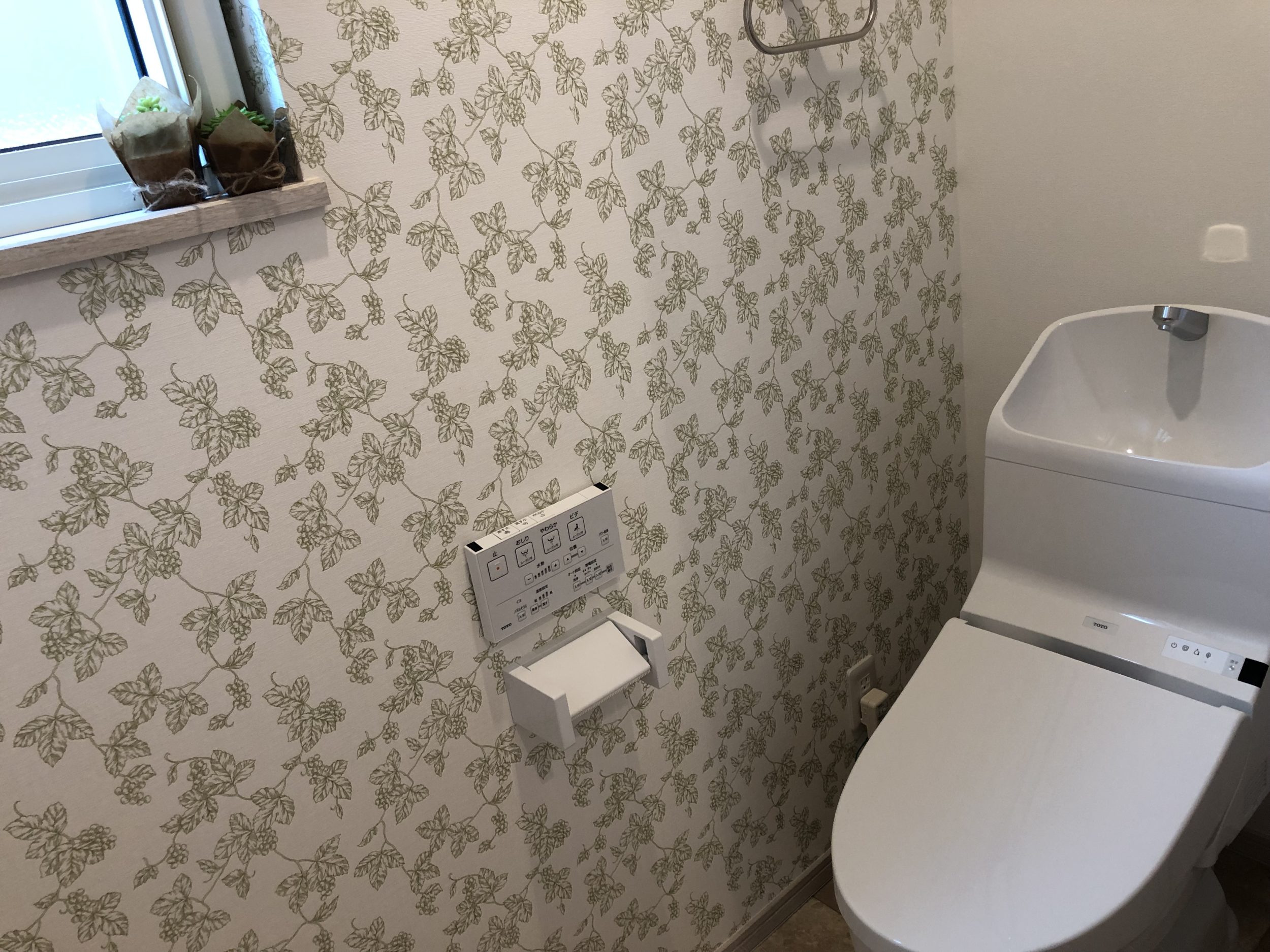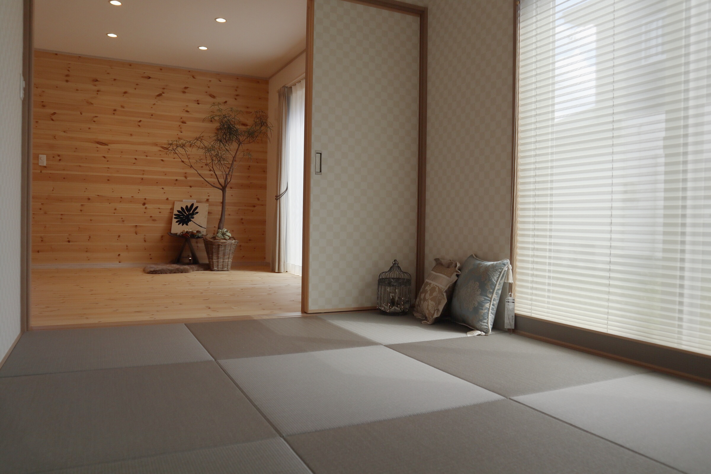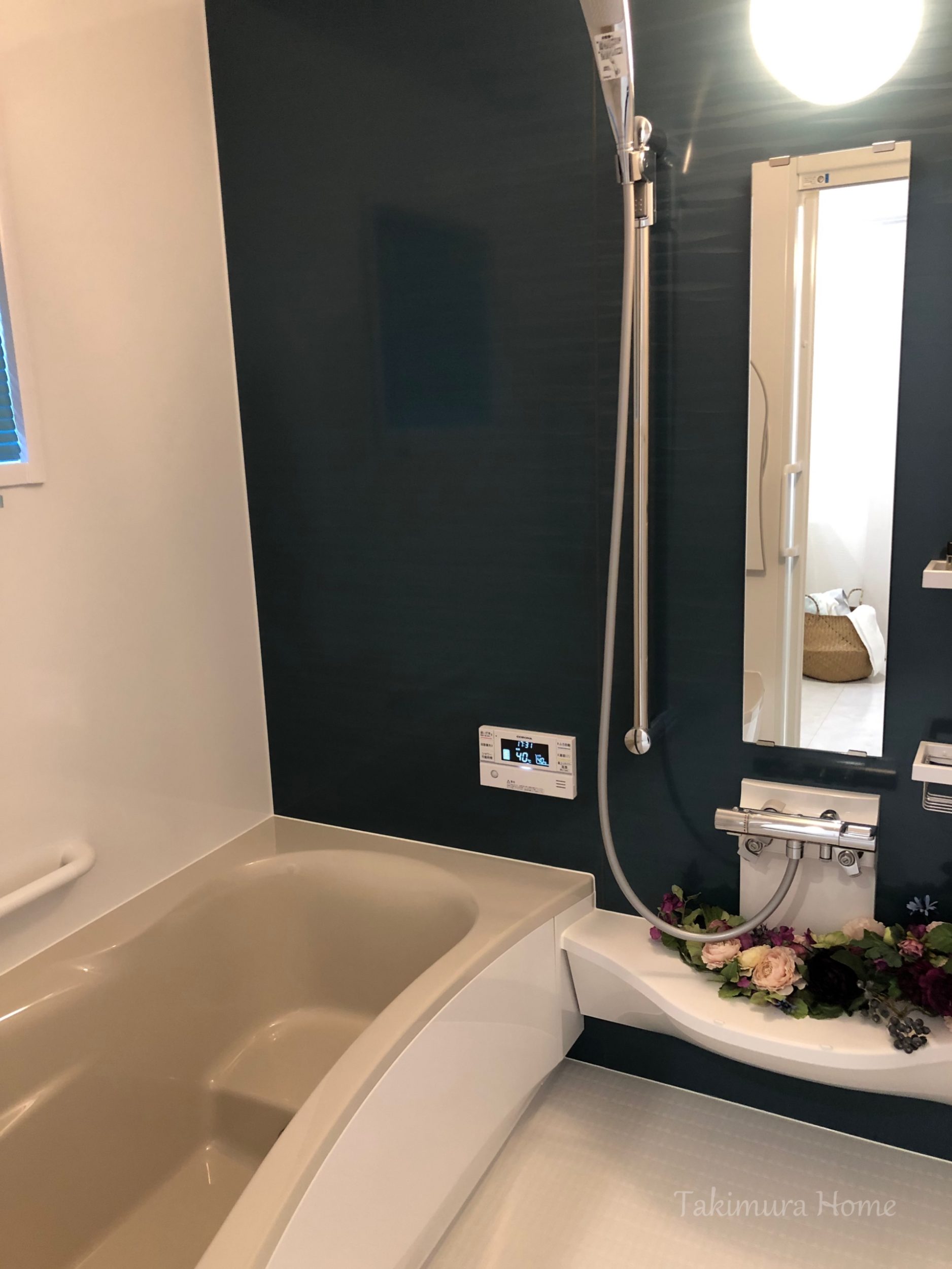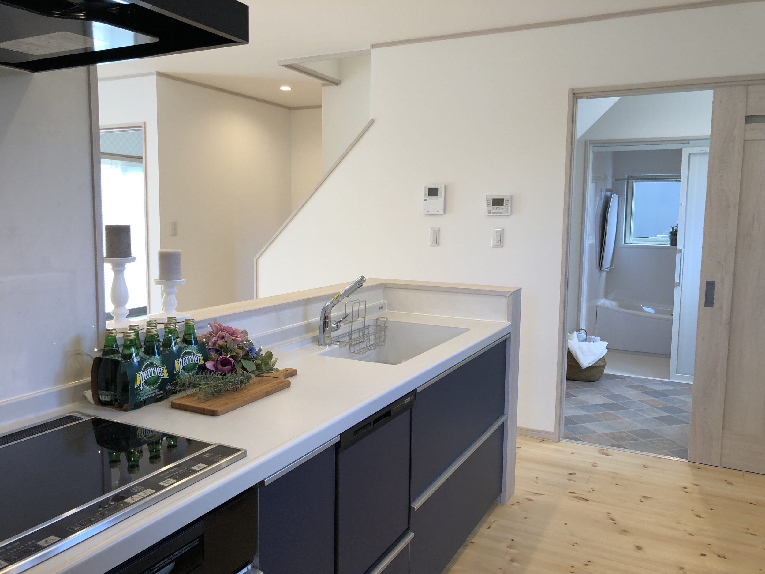 こ自然素材の温かみと個性を大切にしながら、シンプルで洗練されたデザインを目指しました。外観の白い外壁とグリーンの屋根、玄関ドアは、自然との調和を意識したカラーリングで、ナチュラルで優しい印象を与えています。内装は白無垢のフローリングと板張りの壁面を採用し、木の温もりを存分に感じられる空間を演出しています。部分的に黒の壁紙を取り入れることで、空間にアクセントを加え、全体のバランスを保ちながらもオリジナリティを持たせています。この家は、自然とモダンデザインを融合させ、居心地の良い空間を作り出すことをコンセプトとしています。