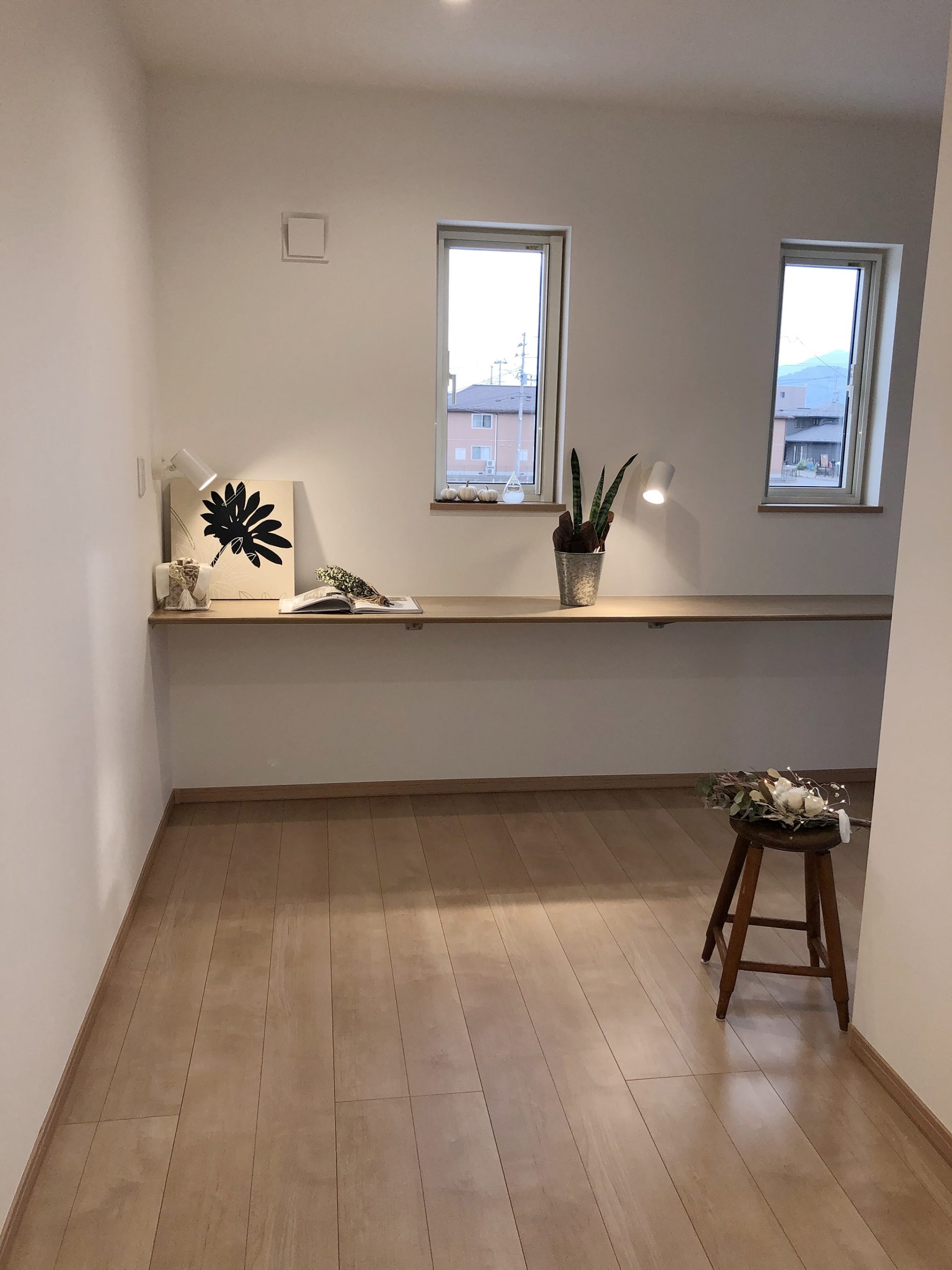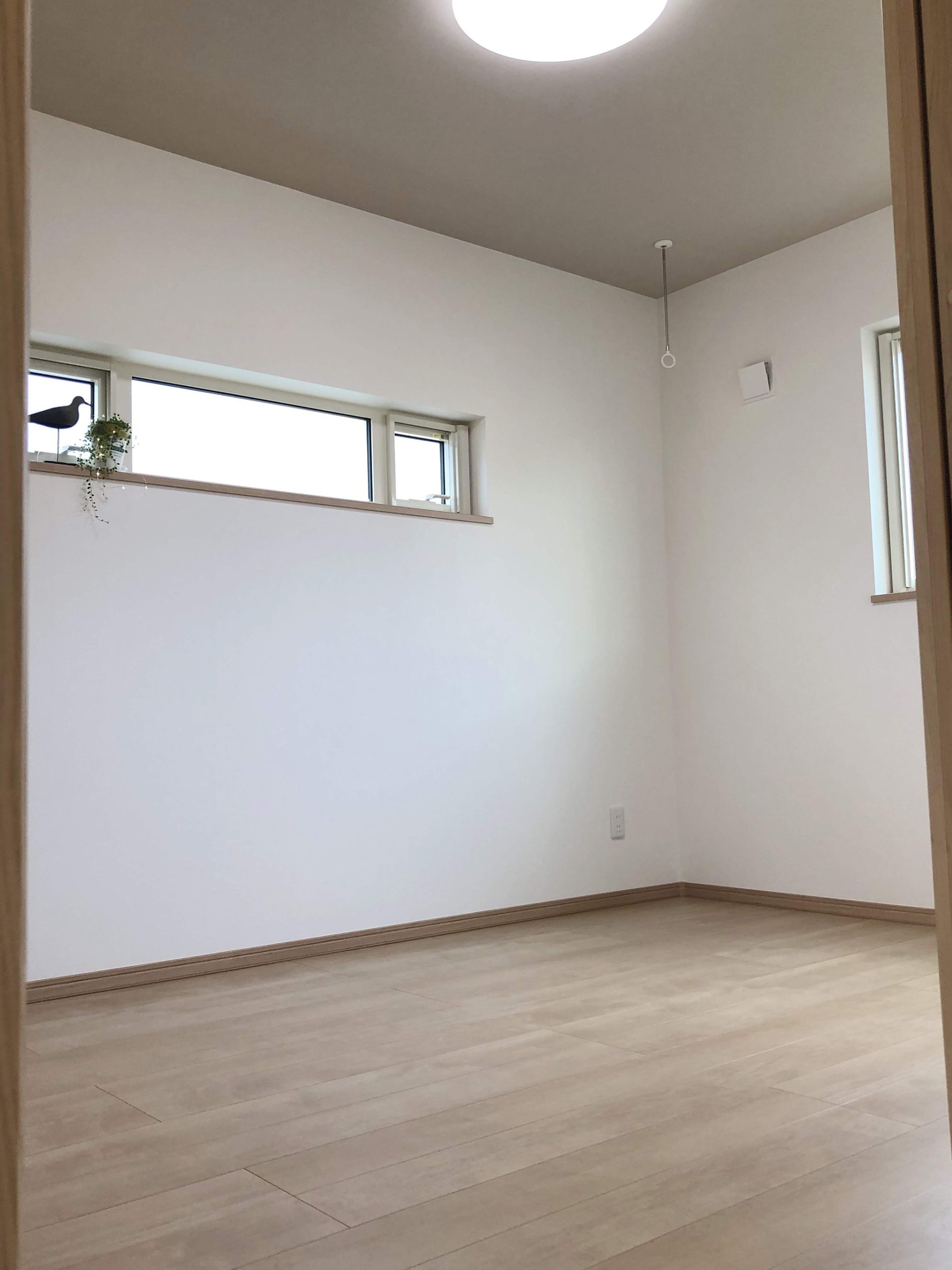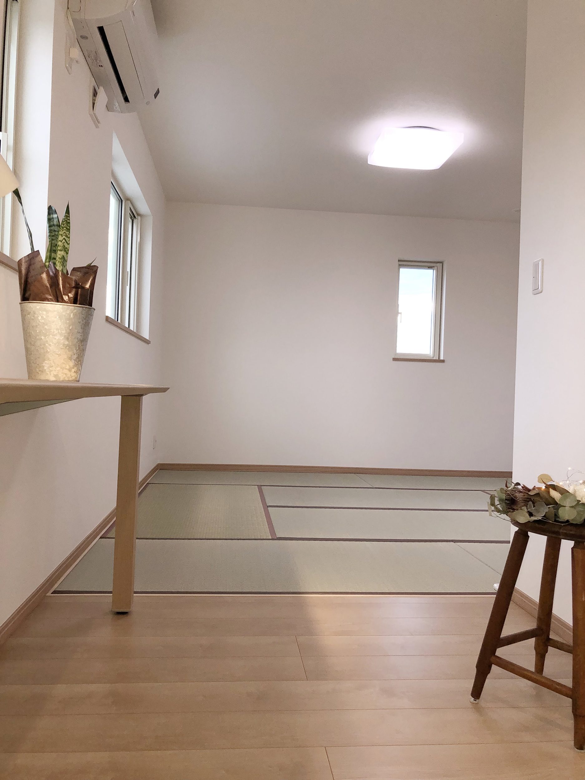 外観は、白を基調とした統一感のあるキューブ型デザインで、清潔感と現代的な印象を与えます。窓枠も白で統一し、外観に一体感を持たせています。内観は、白い壁とフローリングで統一し、広々とした空間を演出。和室も用意することで、伝統的な要素を取り入れていますが、その中にアートとして施されたステンドグラスの窓を取り入れることで、空間に個性的なアクセントを加えています。ステンドグラスは光を美しく反射し、室内に彩りと動きをもたらします。この設計は、シンプルな美しさを追求しながらも、オーナー様の個性やこだわりを反映させた居住空間を提供しています。