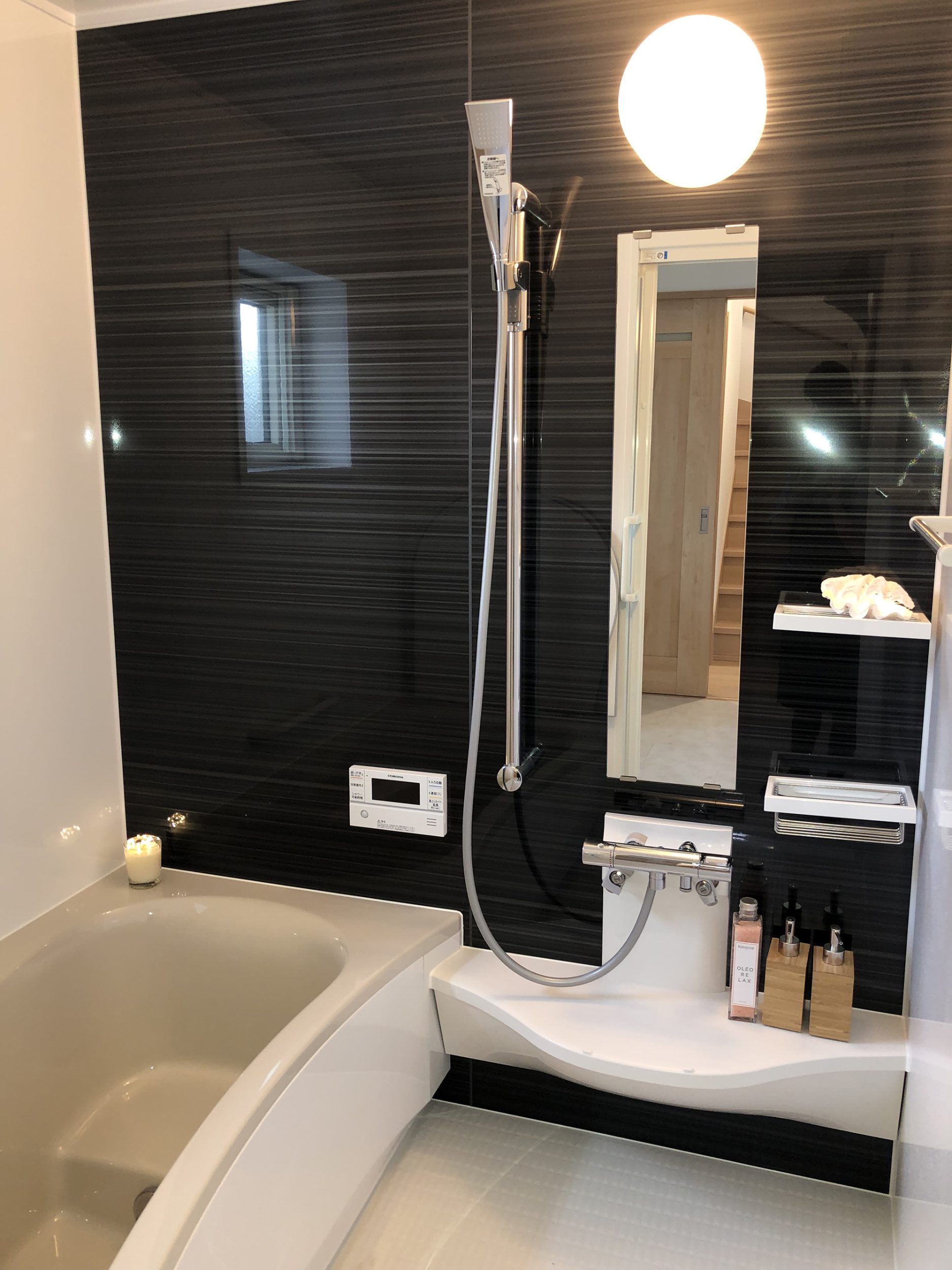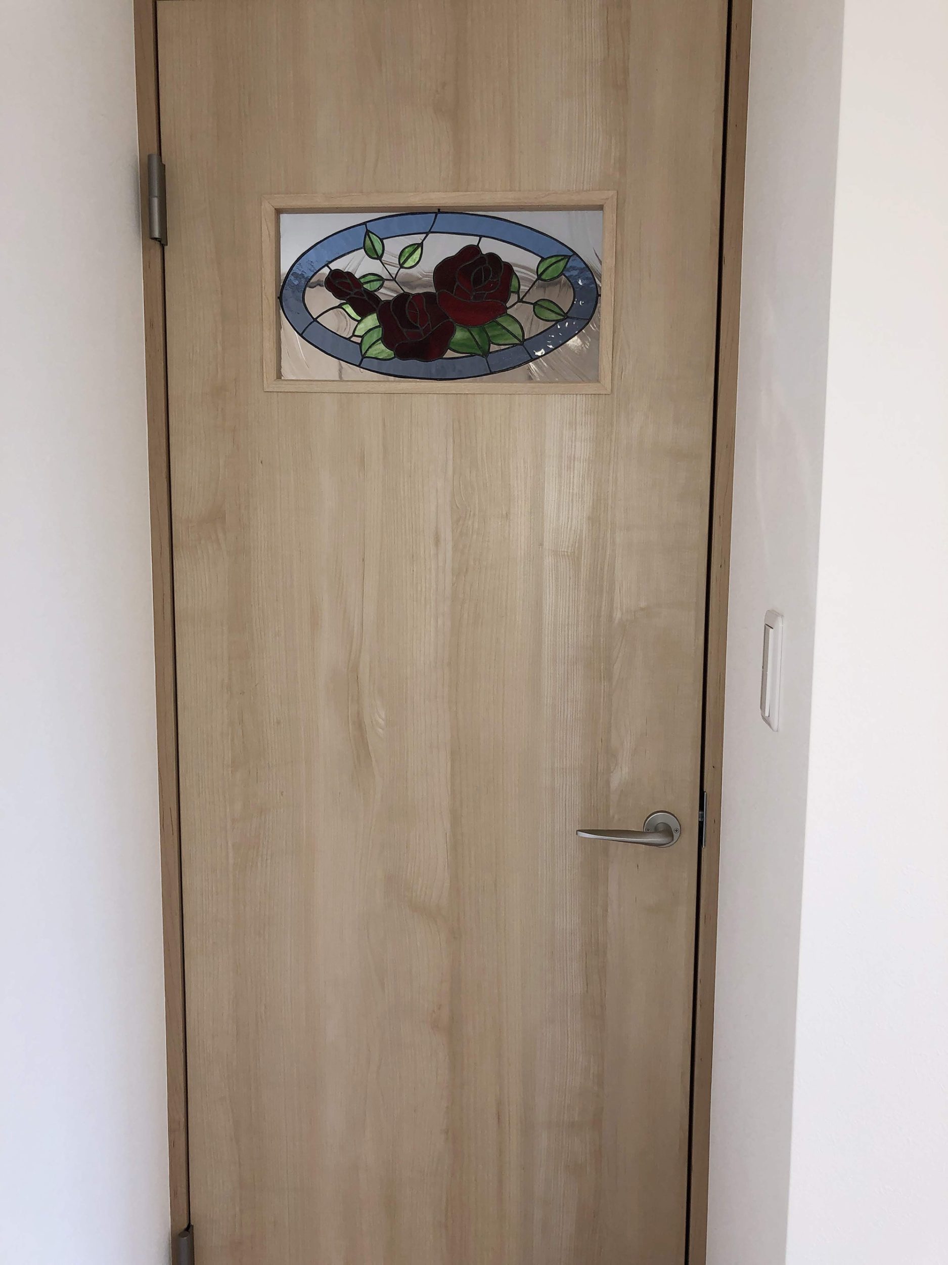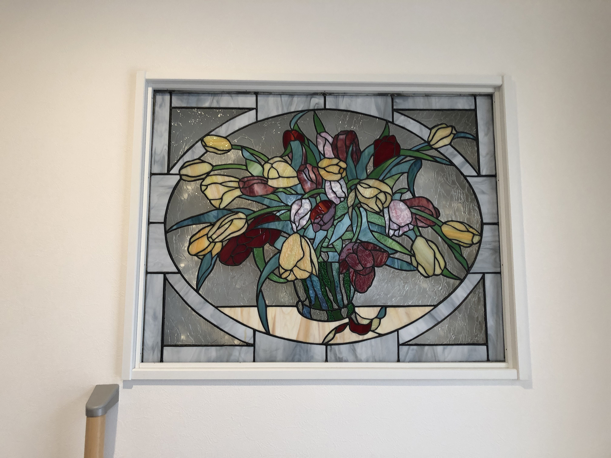 外観は、白を基調とした統一感のあるキューブ型デザインで、清潔感と現代的な印象を与えます。窓枠も白で統一し、外観に一体感を持たせています。内観は、白い壁とフローリングで統一し、広々とした空間を演出。和室も用意することで、伝統的な要素を取り入れていますが、その中にアートとして施されたステンドグラスの窓を取り入れることで、空間に個性的なアクセントを加えています。ステンドグラスは光を美しく反射し、室内に彩りと動きをもたらします。この設計は、シンプルな美しさを追求しながらも、オーナー様の個性やこだわりを反映させた居住空間を提供しています。