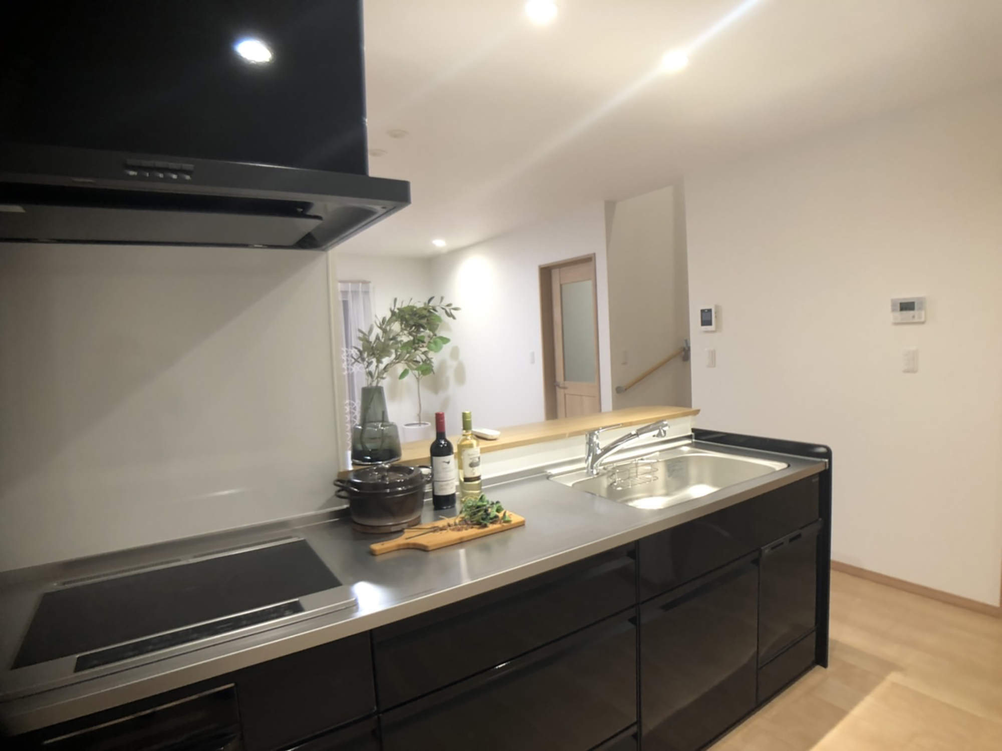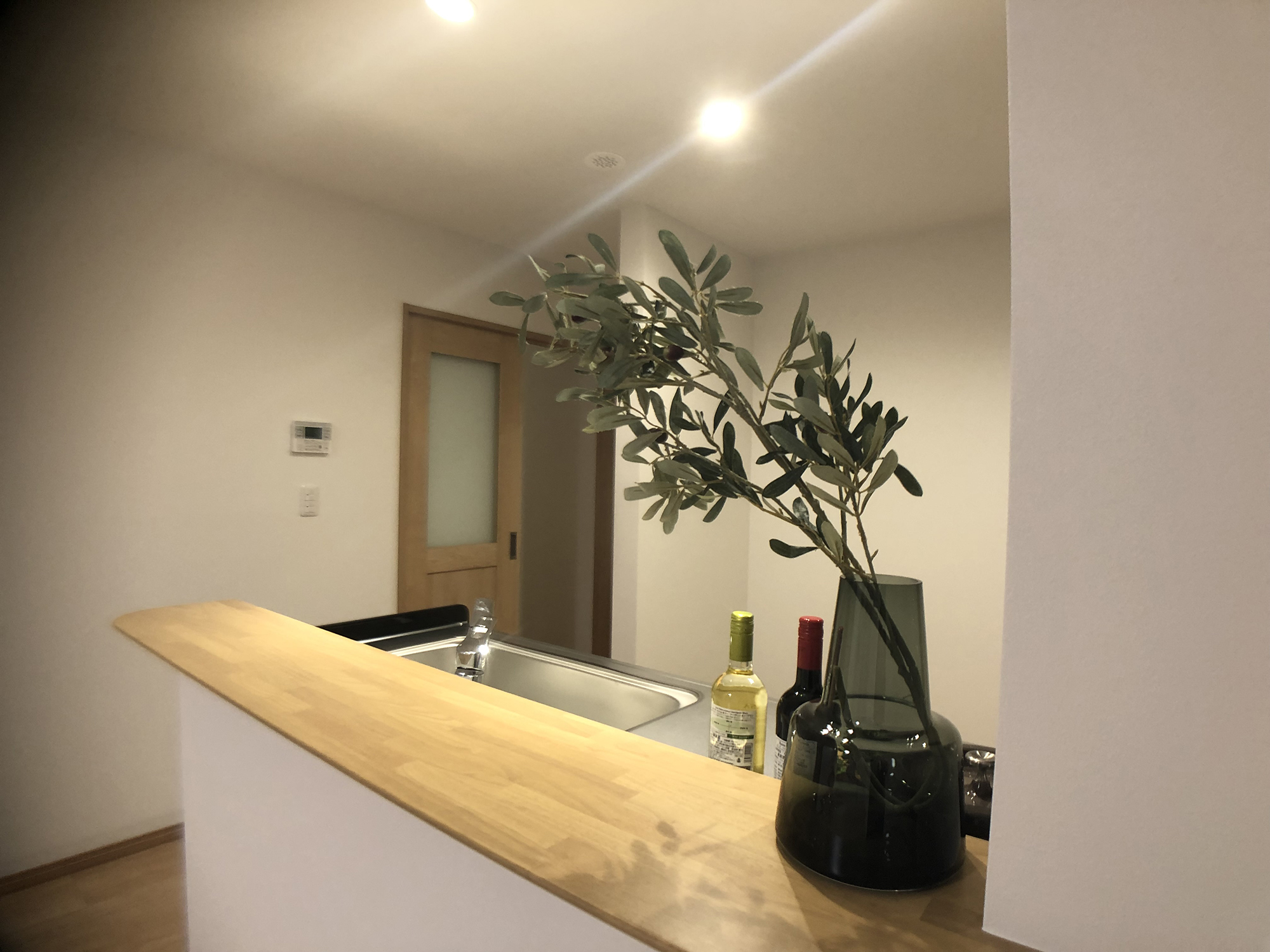 外観は一見普通に見える白い2階建てでありながら、外壁のデザインにこだわりを持ち、洗練された印象を与えています。室内は、白無垢のフローリングと白い壁を基調にし、清楚で落ち着いた雰囲気を漂わせています。和の要素として床の間のある畳の和室を設け、伝統的な趣を加えつつ、現代的なデザインと融合させています。バリアフリーの設計も取り入れ、段差をなくし手すりを備え付けることで、安全で使い勝手の良い空間を実現。2階には広々としたツインシンクの洗面スペースを設け、実用性も重視しました。全体として、シンプルでありながらも細部に配慮し、快適で実用的な住まいを提供することを目指した設計です。