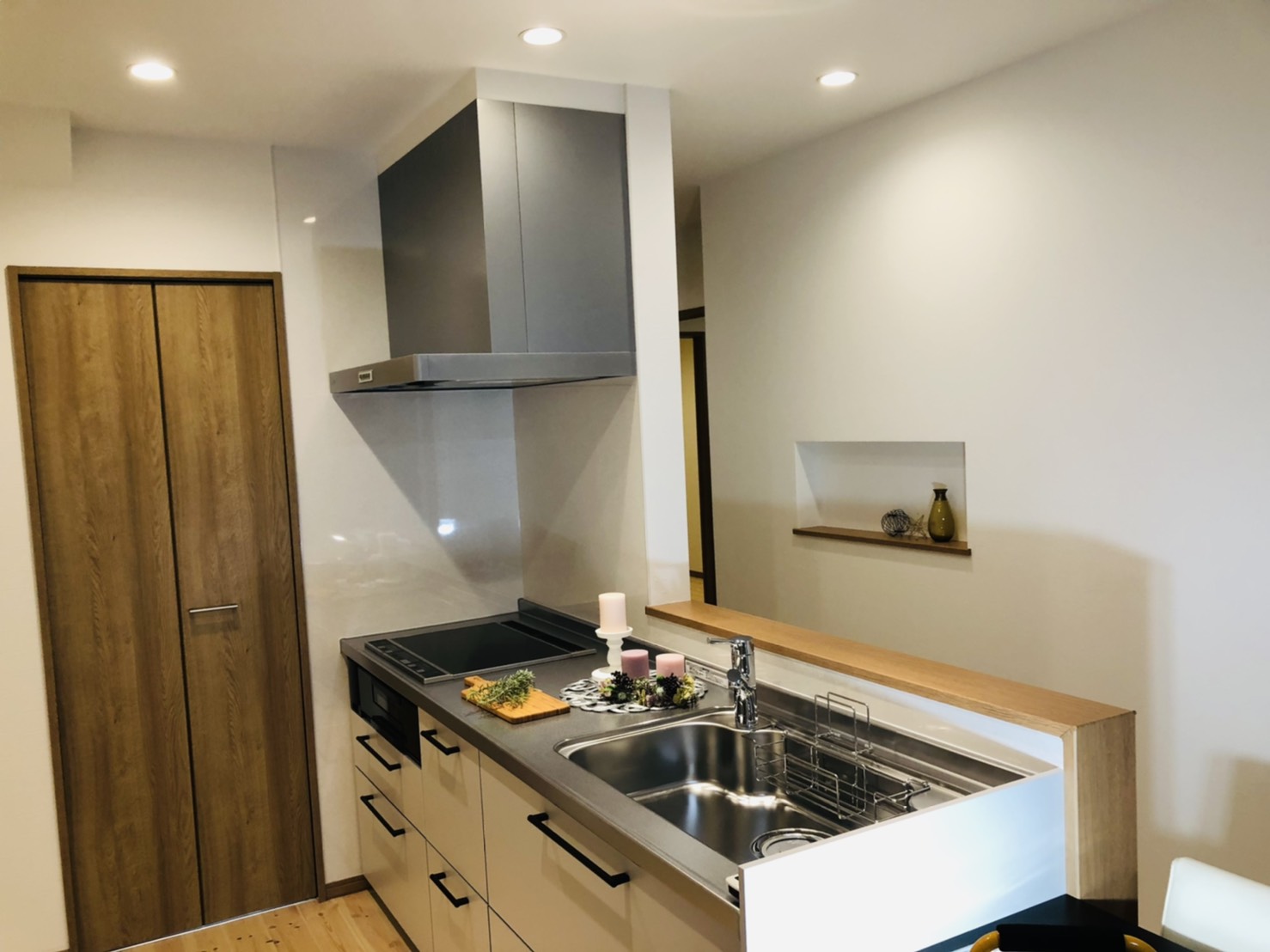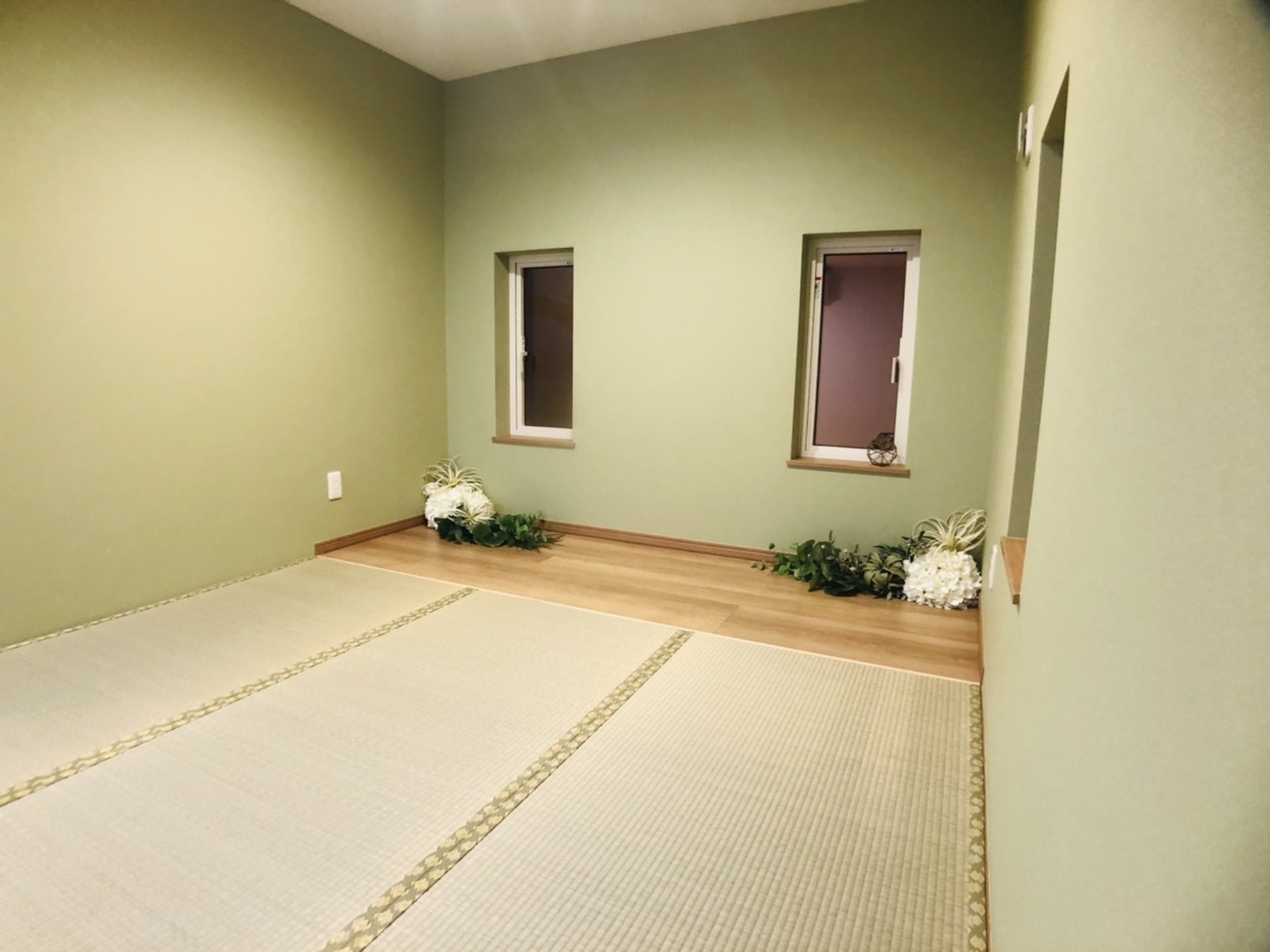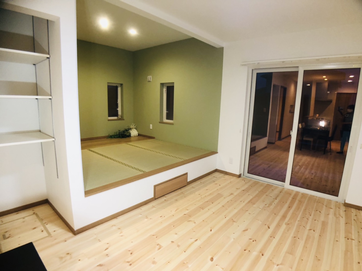 白い外観はシンプルでありながら清潔感を強調し、無駄のない美しい佇まいを実現。一方、内観では白とグリーンの壁紙を採用し、清潔で爽やかな空間を演出しています。平屋ならではのスムーズな動線を重視し、暮らしやすさを追求しました。また、畳の部屋を取り入れることで、日本の伝統的な要素も残しつつ、モダンなデザインとの調和を図っています。シンプルながらも、心地よく快適に過ごせる家を目指して設計された住まいです。
