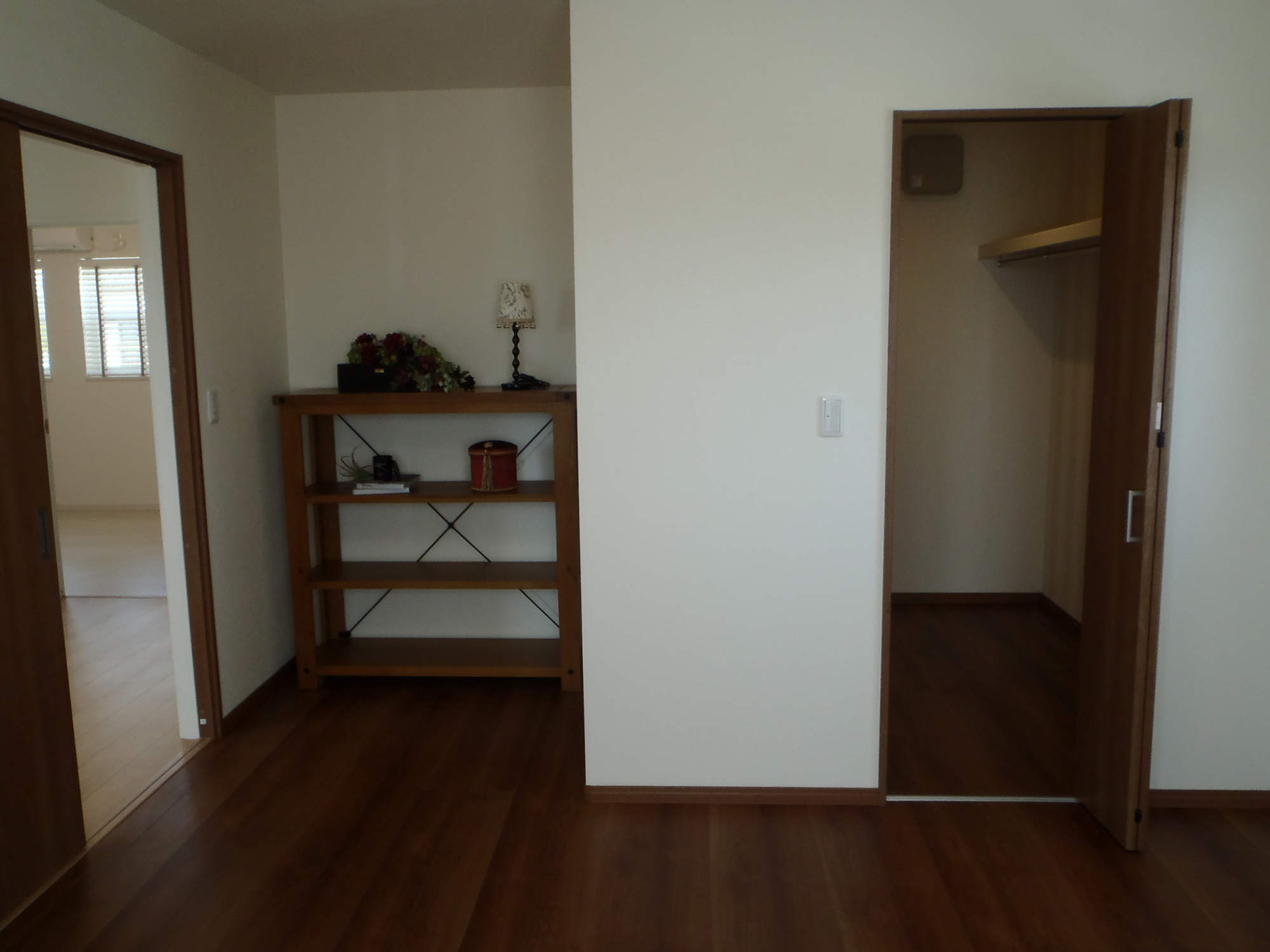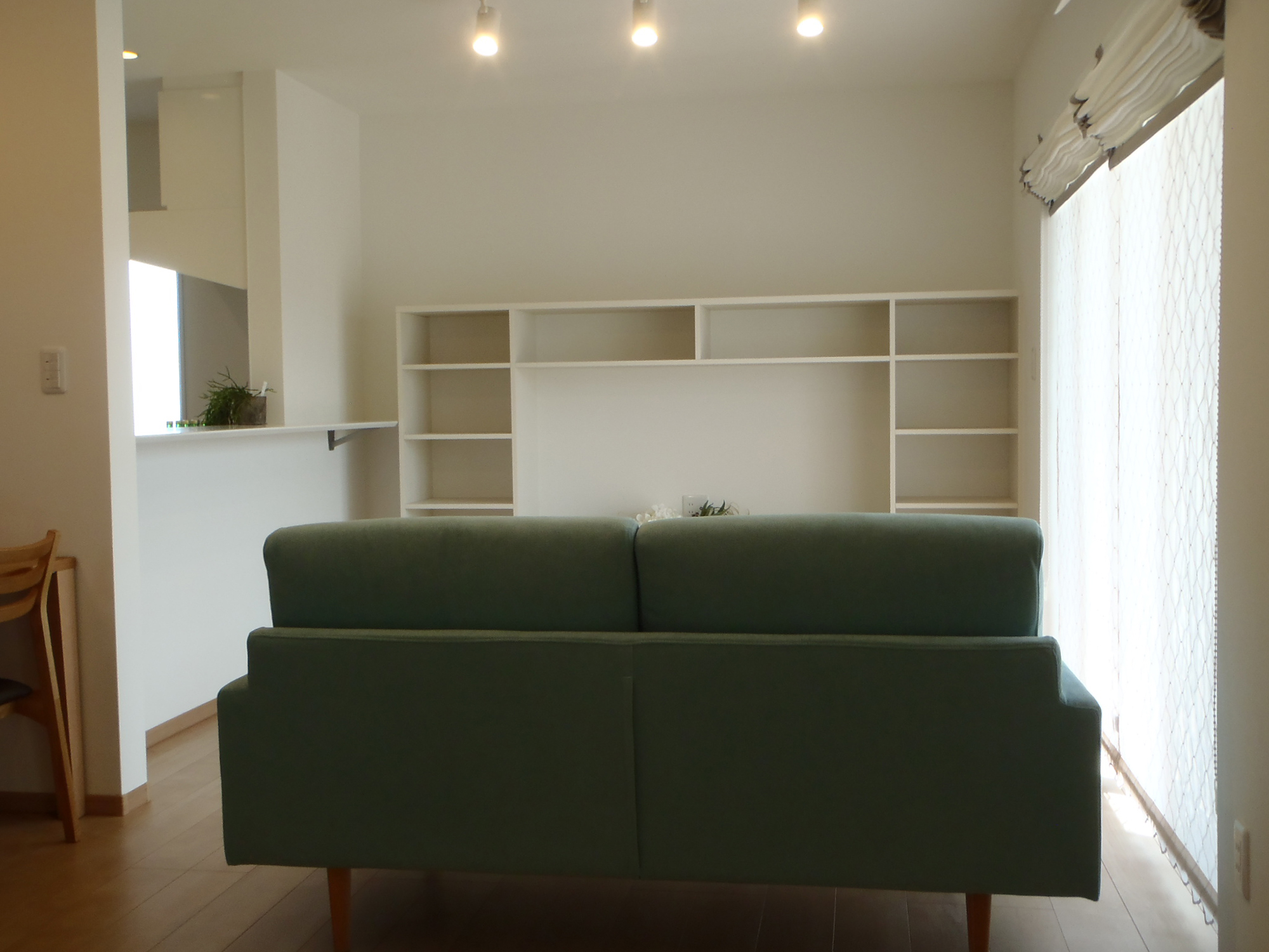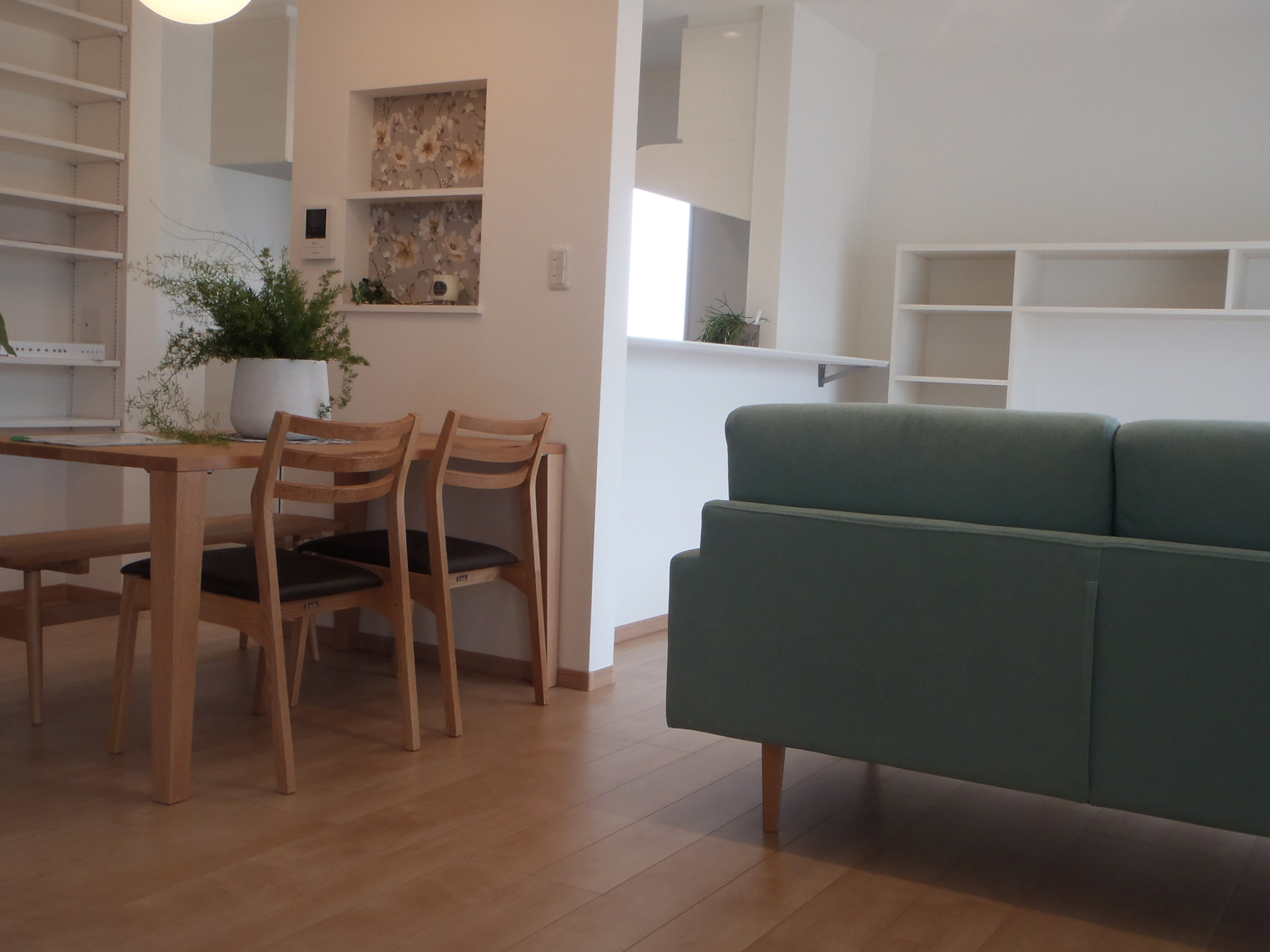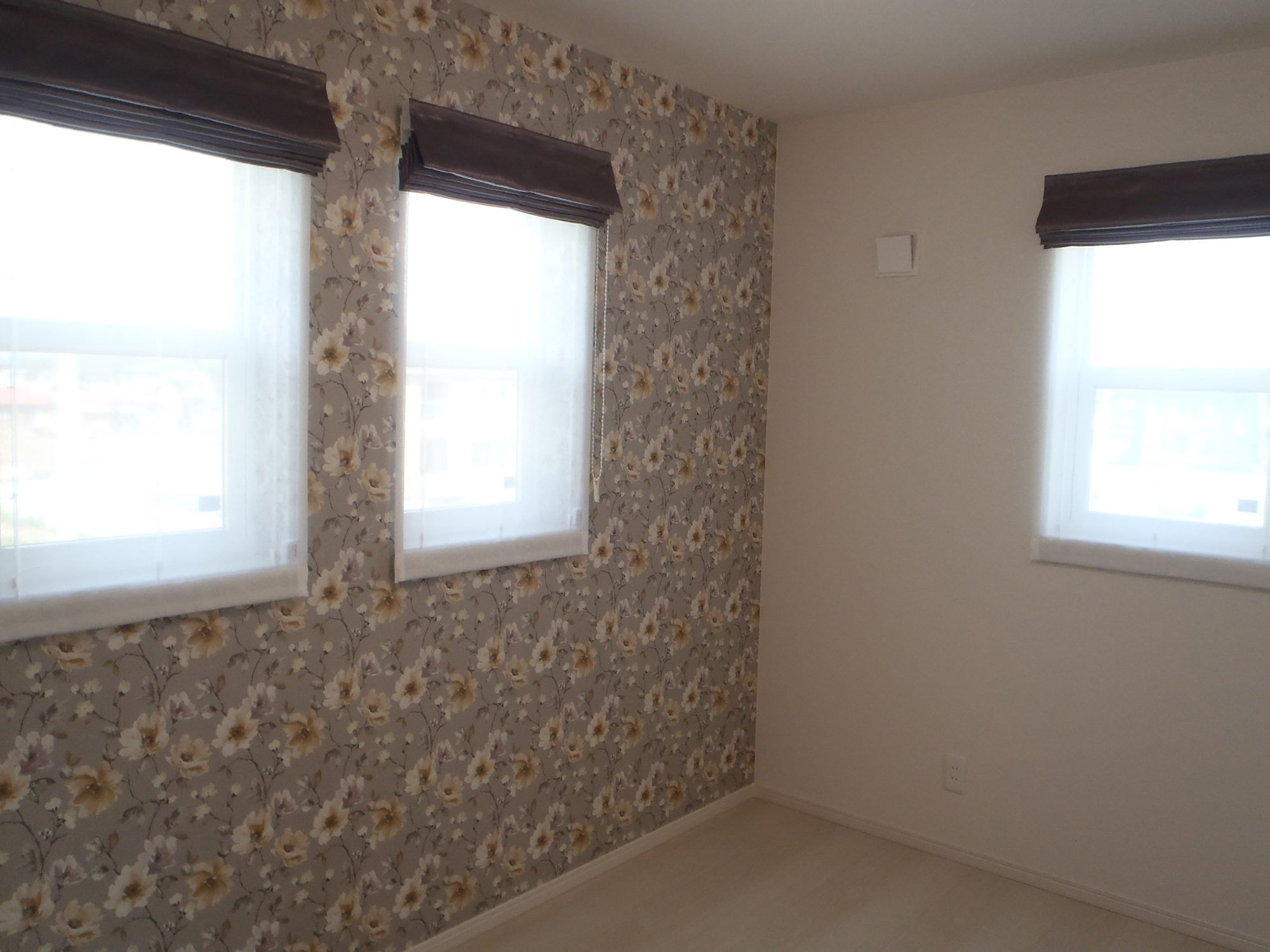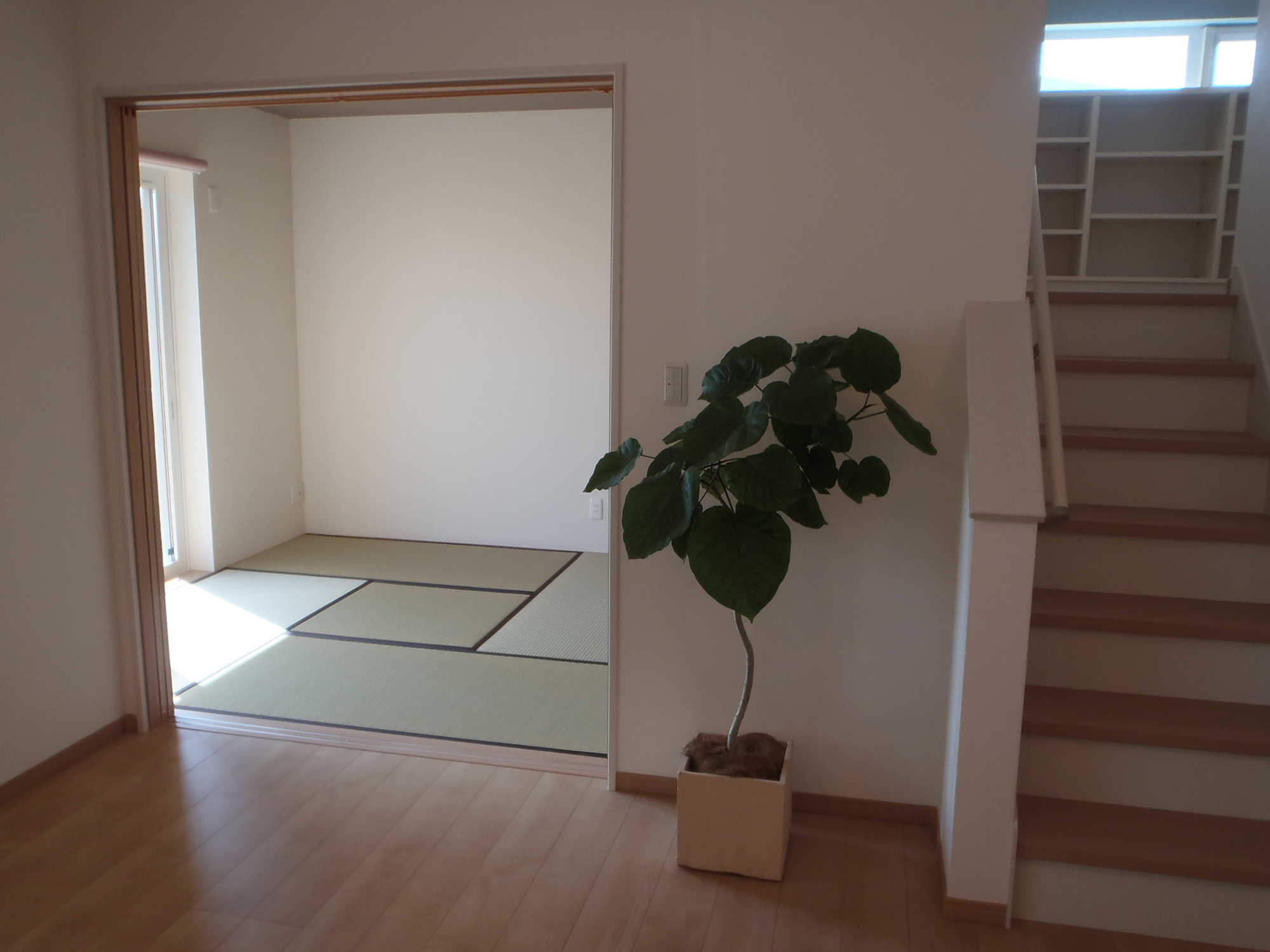 外観は白い外壁と白い窓枠で統一されたキューブ型のデザインで、モダンで洗練された印象を与えています。このシンプルさに対し、室内では個性を大切にし、各部屋ごとに異なる壁紙とフローリングを選び、豊かなデザインのバリエーションを楽しめるようにしています。和室も設けられており、伝統的な要素と現代的なデザインが融合した居心地の良い空間を提供しています。また、2階にトイレと洗面所を配置することで、機能性を高め、家全体の利便性を向上させています。この設計は、シンプルな外観に対して内部の多様性を強調し、どの部屋にいても快適で個性的な居住空間を提供することを目指しています。